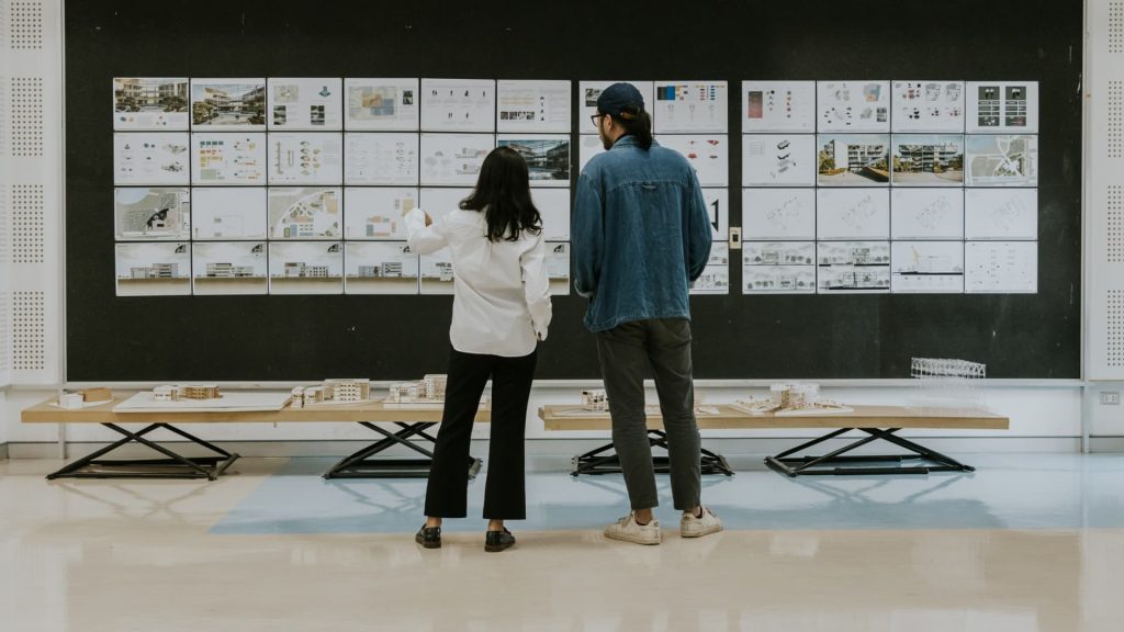 Two architecture teachers discuss a student’s final project work.