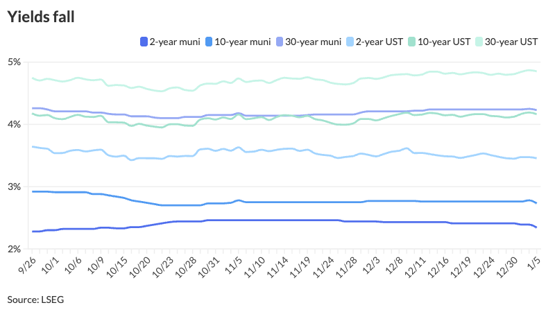 Muni yields fell Monday, as U.S. Treasuries saw small gains and equities ended up in aftermath of the capture of Venezuelan President Nicolás Maduro.