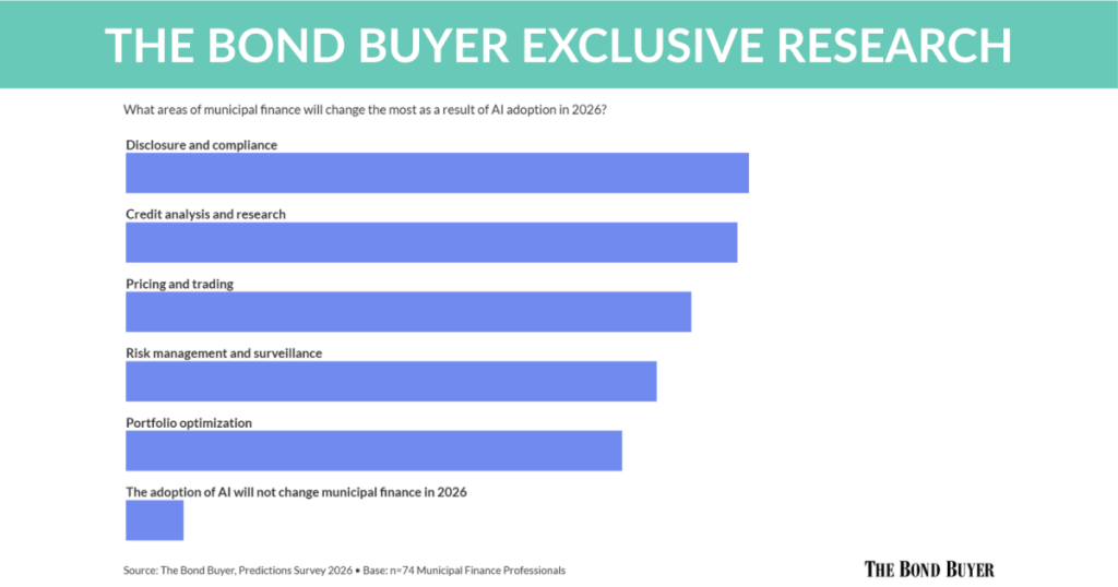 Disclosure and compliance (54%) was the number one area identified by municipal finance professionals as on the brink of major change due to AI in 2026. Credit analysis and research (53%) was close behind, followed by pricing and trading (49%), risk management and surveillance (46%) and portfolio optimization (43%).