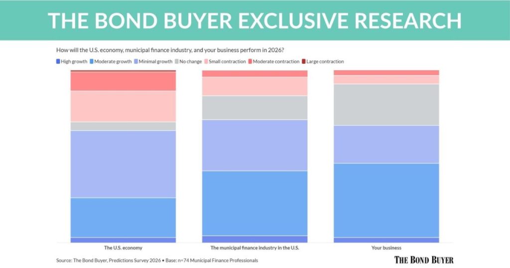 The Bond Buyer Predictions 2026 survey was fielded online during November and December, with responses from 74 municipal finance professionals. Respondents represent a range of organization types, with the largest shares from broker-dealers (27%), issuers (18%), municipal advisors (16%), and law firms (8%).