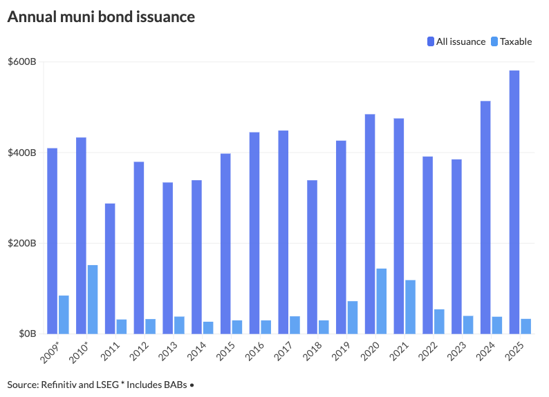 Since the release of part one of my 2026 Outlook, LSEG has revised slightly upward its 2025 volume total to just over $581 billion from almost $580 billion previously. Strong capital needs, a supportive rate environment, and looming concerns over the loss of the muni tax-exemption during the first half of 2025 were all drivers of 2025 supply.