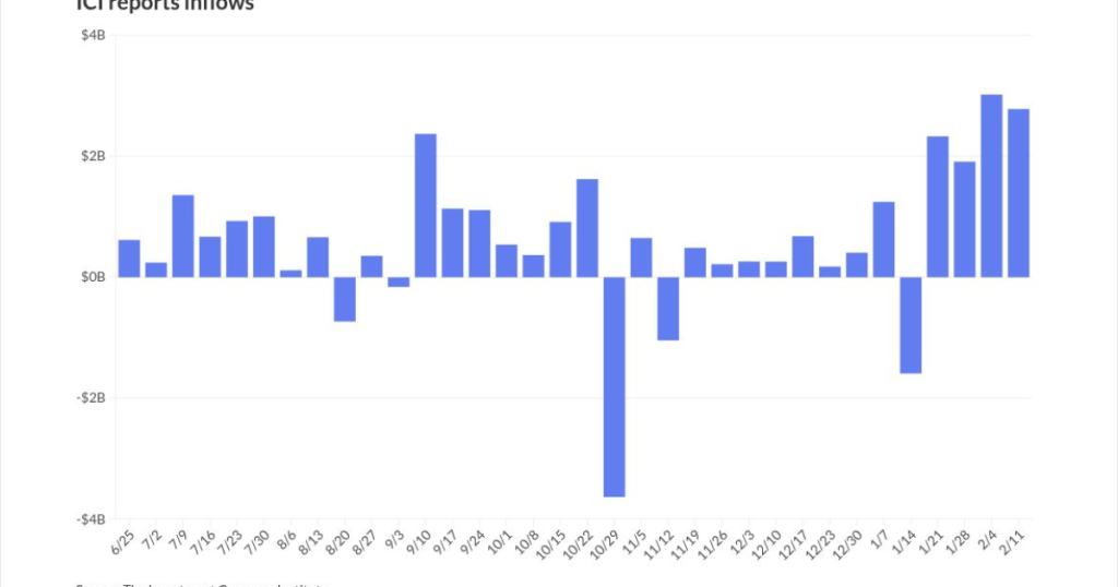 The Investment Company Institute Wednesday reported inflows of $2.784 billion for the week ending Feb. 11, following $3.024 billion of inflows the previous week.