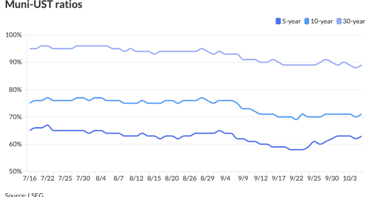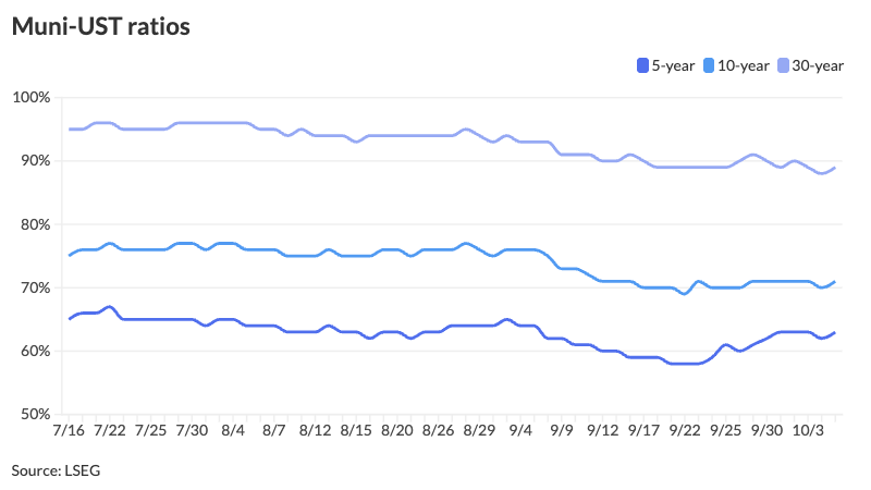 The two-year muni-UST ratio Tuesday was at 65%, the five-year at 63%, the 10-year at 71% and the 30-year at 89%, according to Municipal Market Data’s 3 p.m. EDT read. ICE Data Services had the two-year at 64%, the five-year at 62%, the 10-year at 70% and the 30-year at 89% at a 4 p.m. read.