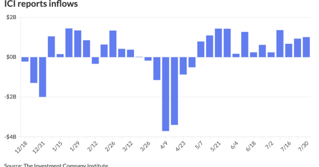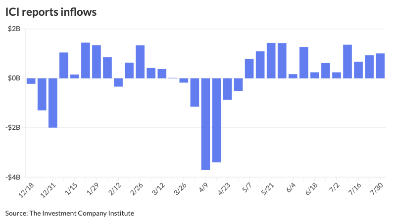 The Investment Company Institute Wednesday reported $1.008 billion of inflows for the week ending July 30, following $931 million of inflows the previous week.
