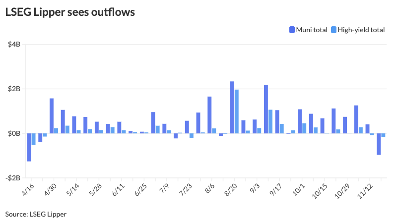 Investors pulled $965.8 million from municipal bond mutual funds in the week ended Wednesday, following $404 million of inflows the prior week, according to LSEG Lipper data. This is the largest outflow figure since the week ending April 16, when mutual funds saw $1.258 billion pulled.