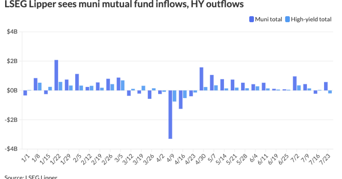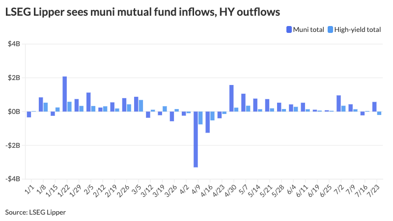 Investors added $571.5 million to municipal bond mutual funds in the week ended Wednesday, following $224.6 million of outflows the prior week, according to LSEG Lipper data.