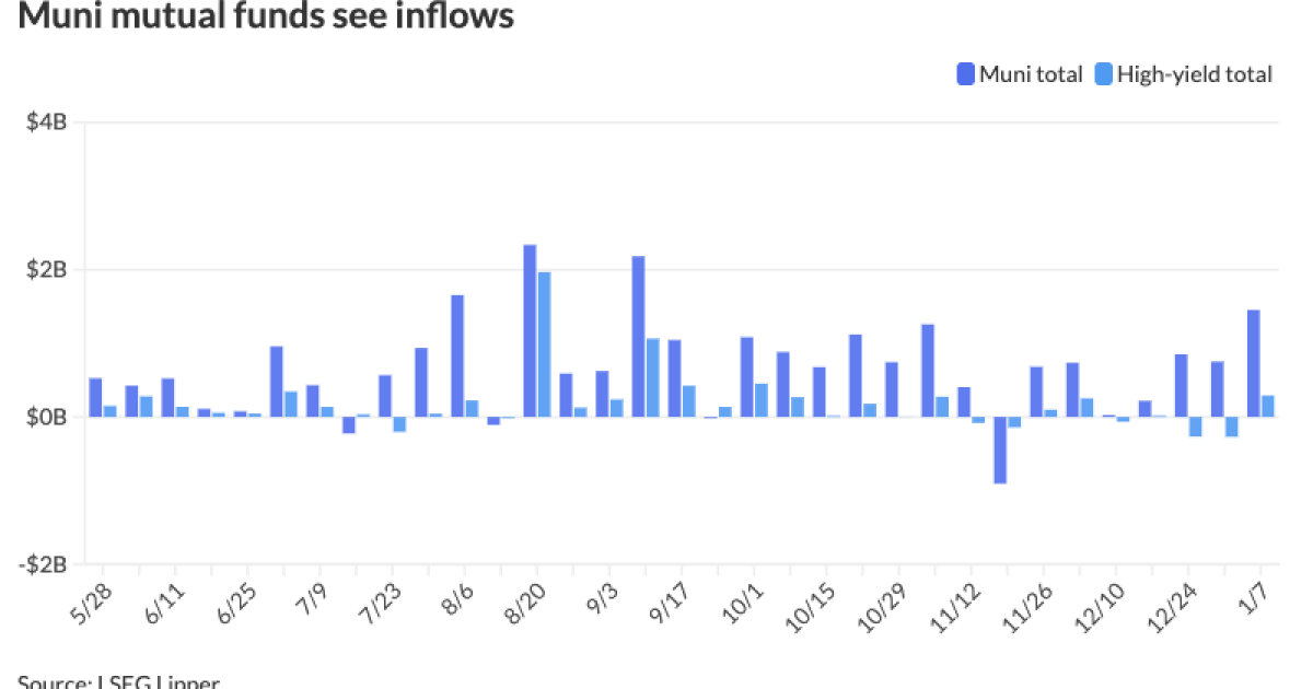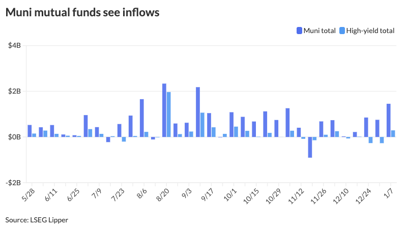 Investors added $1.454 billion to municipal bond mutual funds in the week ended Wednesday, following $751.8 million of inflows the prior week, according to LSEG Lipper data.
