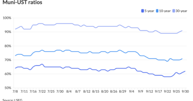 The two-year muni-UST ratio Thursday was at 65%, the five-year at 61%, the 10-year at 64% and the 30-year at 87%, according to Municipal Market Data’s 3 p.m. EDT read. ICE Data Services had the two-year at 64%, the five-year at 61%, the 10-year at 64% and the 30-year at 86% at a 4 p.m. read.