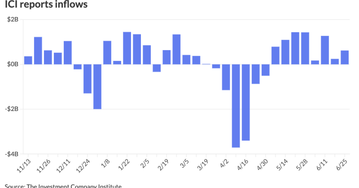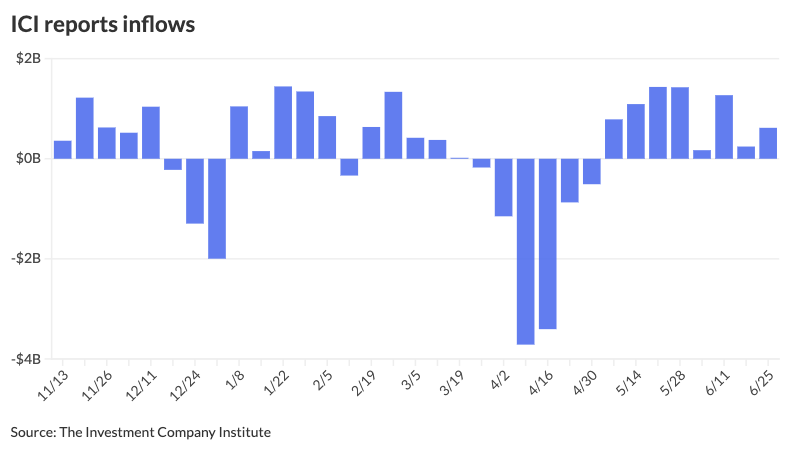 The Investment Company Institute reported Wednesday $618 million of inflows for the week ending June 25, following $244 million of inflows the previous week.
