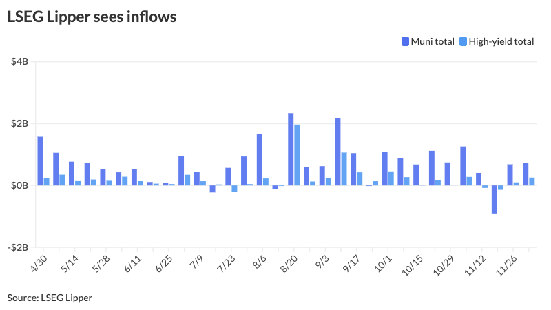 Investors added $736.2 million from municipal bond mutual funds in the week ended Wednesday, following $682.2 million of inflows the prior week, according to LSEG Lipper data.