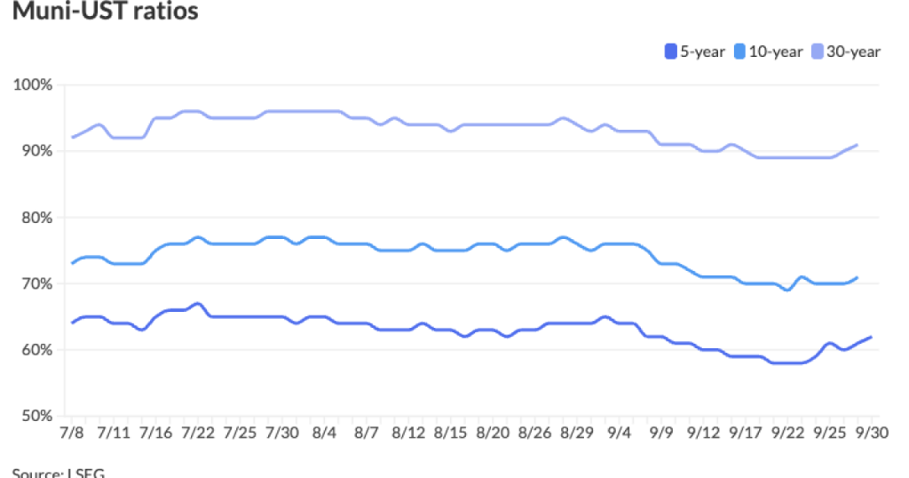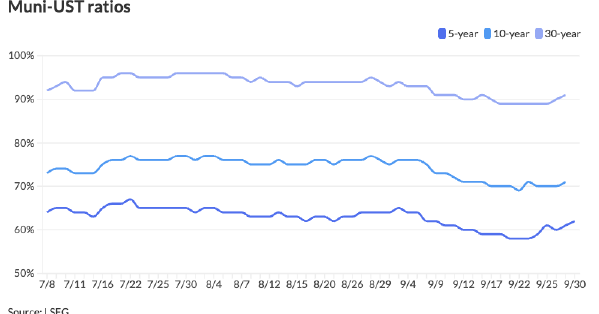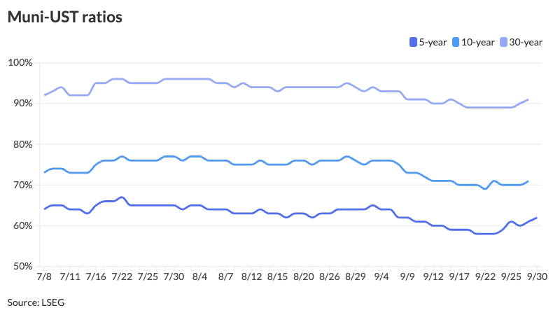The two-year muni-UST ratio Tuesday was at 64%, the five-year at 62%, the 10-year at 71% and the 30-year at 90%, according to Municipal Market Data’s 3 p.m. ET read. ICE Data Services had the two-year at 62%, the five-year at 61%, the 10-year at 70% and the 30-year at 90% at a 4 p.m. read.