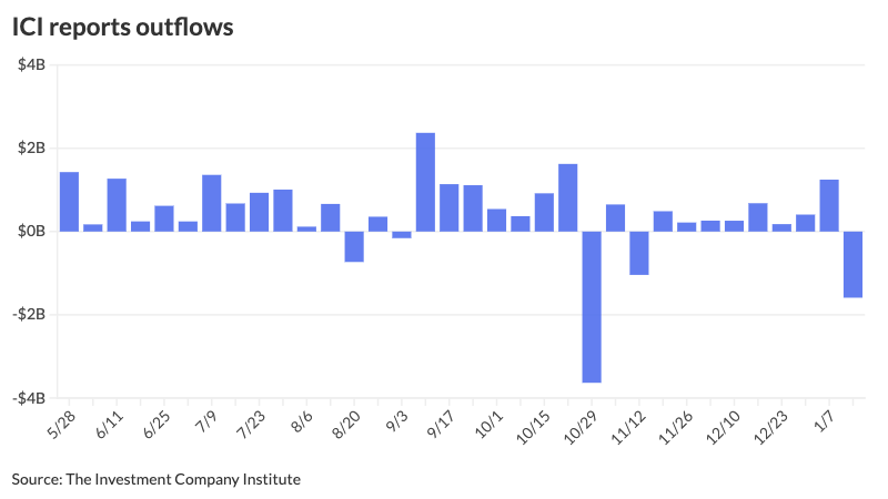 The Investment Company Institute Wednesday reported outflows of $1.59 billion for the week ending Jan. 14, following $1.247 billion of inflows the previous week. This differs from LSEG Lipper, which reported investors added $1.825 billion to mutual funds over the same time period.