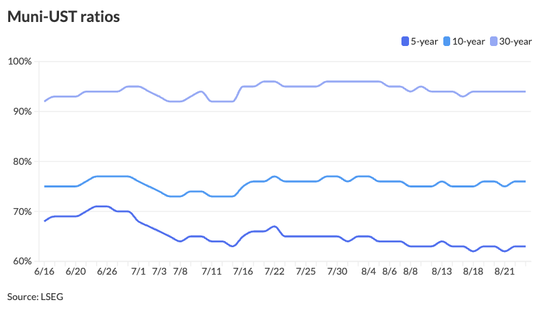 The two-year muni-UST ratio Tuesday was at 60%, the five-year at 63%, the 10-year at 76% and the 30-year at 94%, according to Municipal Market Data’s 3 p.m. ET read. ICE Data Services had the two-year at 59%, the five-year at 63%, the 10-year at 74% and the 30-year at 94% at a 4 p.m. read.