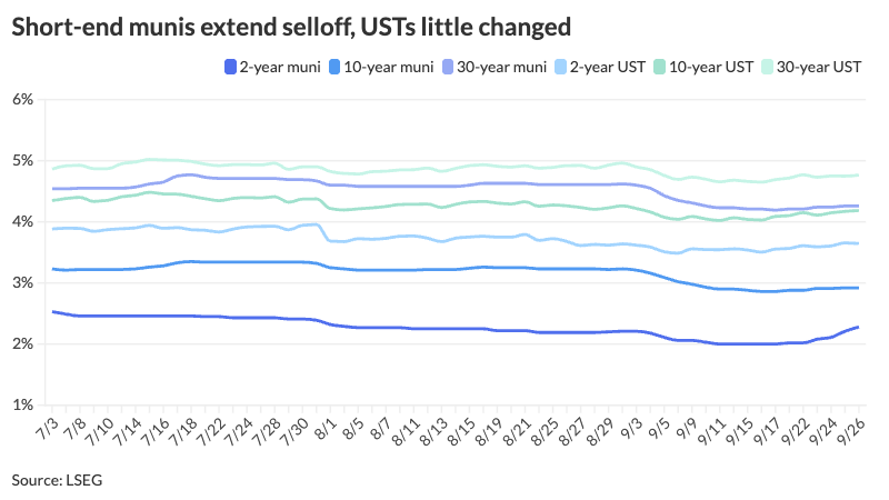 The spike in muni yields comes as people are positioning for the end of the third quarter, which happens Tuesday, and a potential federal government shutdown, which would add volatility to the market, he said.