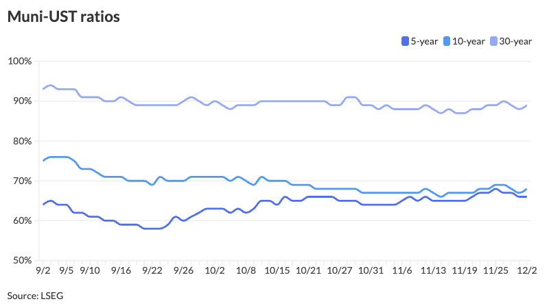 The two-year muni-UST ratio Tuesday was at 70%, the five-year at 66%, the 10-year at 68% and the 30-year at 89%, according to Municipal Market Data’s 3 p.m. EDT read. ICE Data Services had the two-year at 70%, the five-year at 66%, the 10-year at 68% and the 30-year at 88% at a 3 p.m. read.