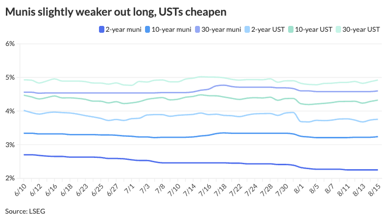 The S&P Global Market Intelligence municipal curve was cut two basis points out long: The one-year was at 2.22% (unch) in 2025 and 2.24% (unch) in 2026. The five-year was at 2.40% (unch), the 10-year was at 3.23% (+2) and the 30-year yield was at 4.59% (+2) at 4 p.m.