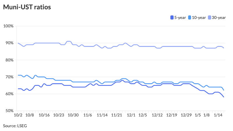 The two-year muni-UST ratio Friday was at 61%, the five-year at 58%, the 10-year at 62% and the 30-year at 87%, according to Municipal Market Data’s 3 p.m. EDT read. ICE Data Services had the two-year at 61%, the five-year at 59%, the 10-year at 64% and the 30-year at 87% at a 3 p.m. read.