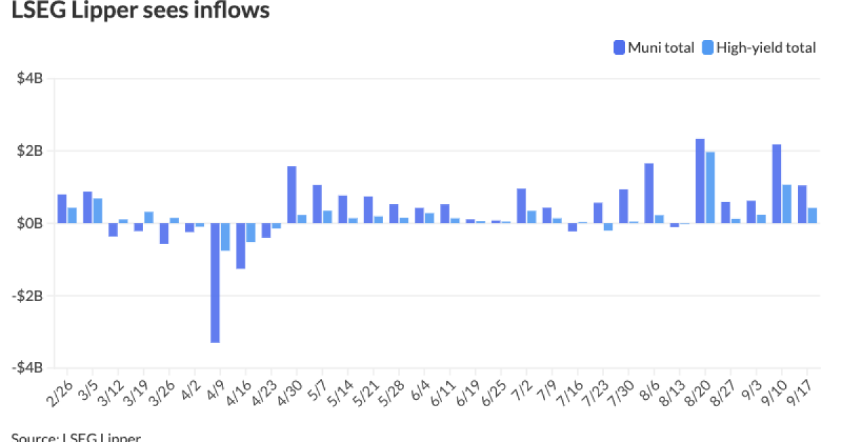 Investors added $1.045 billion to municipal bond mutual funds in the week ended Wednesday, following $2.182 billion of inflows the prior week, according to LSEG Lipper data. This is some “moderation” after last week’s massive inflow, according to J.P. Morgan strategists, led by Peter DeGroot.