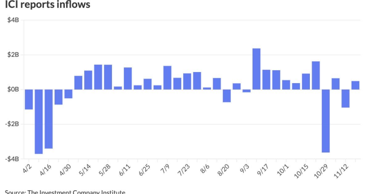 The Investment Company Institute Wednesday reported inflows of $488 million for the week ending Nov. 19, following $1.042 billion of outflows the previous week. This differs from the $965.8 million of outflows, as reported by LSEG Lipper, over the same time period.