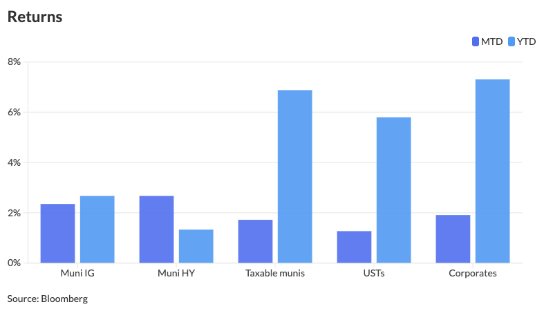 Munis and USTs have seen strong rallies this month. Tax-exempt munis, supported by USTs, are having a very good month as MMD yields are down 30 to 35 basis points out long, and both the investment-grade and high-yield indices are seeing gains of more than 2% month-to-date, Barclays strategists, led by Mikhail Foux, said.