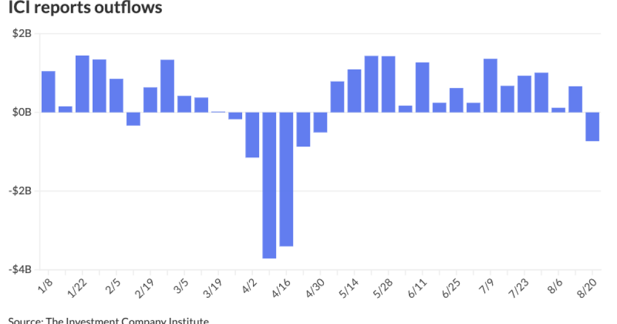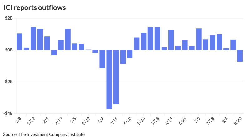 The Investment Company Institute Wednesday reported $732 million of outflows for the week ending Aug. 20, following $663 million of inflows the previous week. This greatly differs from LSEG Lipper’s $2.332 billion of inflows, skewed by an asset allocation shift from equities into fixed income from a single high-yield exchange-traded fund.