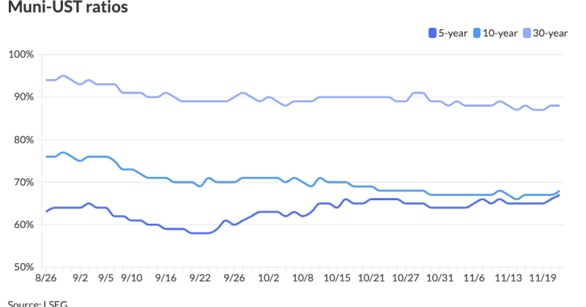 The two-year muni-UST ratio Friday was at 70%, the five-year at 67%, the 10-year at 68% and the 30-year at 88%, according to Municipal Market Data’s 3 p.m. EDT read. ICE Data Services had the two-year at 69%, the five-year at 66%, the 10-year at 68% and the 30-year at 87% at a 4 p.m. read.