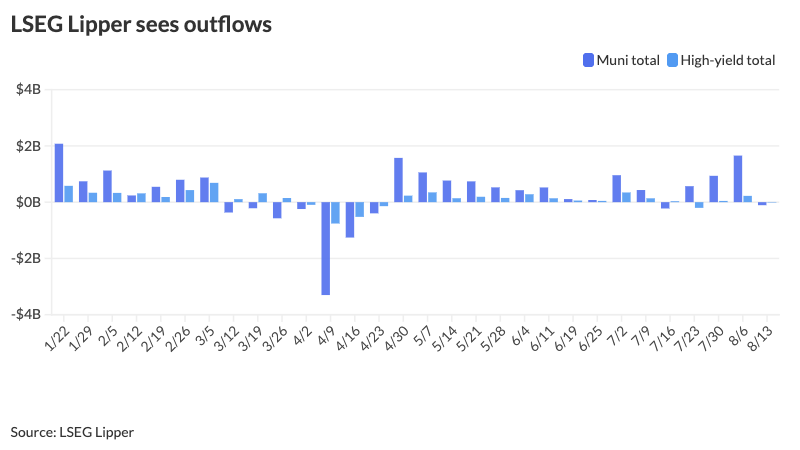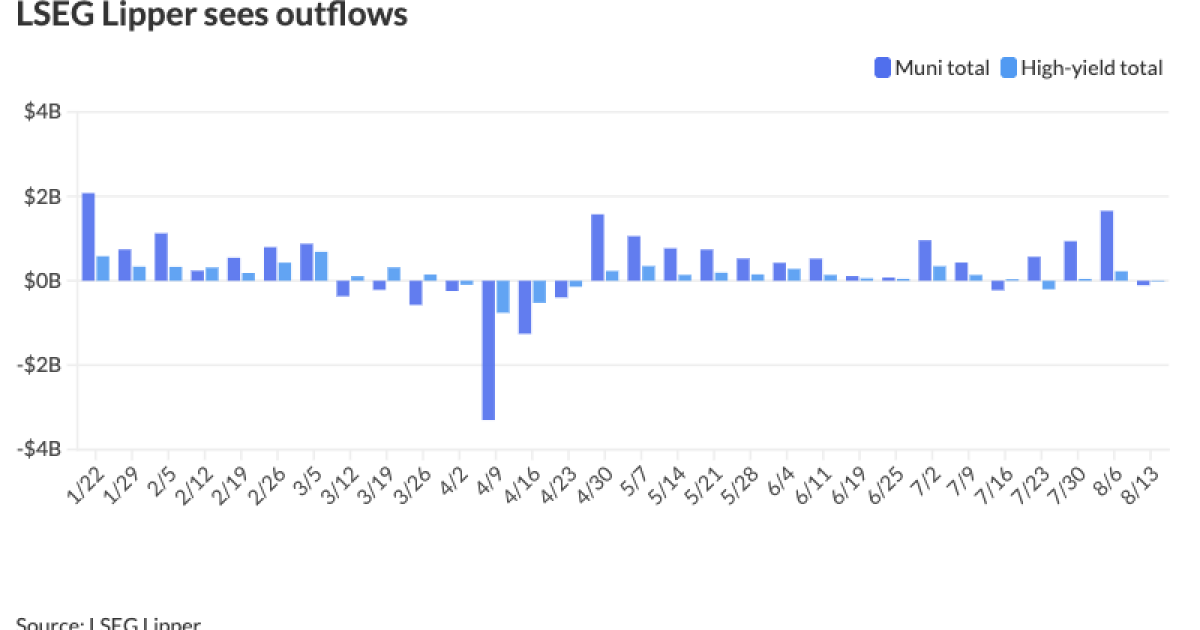 Investors pulled $107.9 million from municipal bond mutual funds in the week ended Wednesday, following $1.656 billion of inflows the prior week, according to LSEG Lipper data.