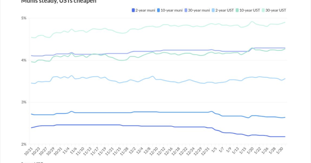 MMD’s scale was little changed: 2.18% (unch, no Feb. roll) in 2027 and 2.18% (unch, no Feb. roll) in 2028. The five-year was 2.24% (unch, no Feb. roll), the 10-year was 2.64% (unch, +1bp Feb. roll) and the 30-year was 4.29% (unch) at 3 p.m.