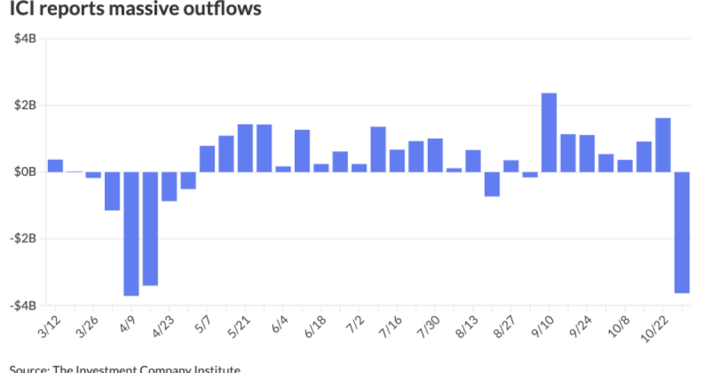 The Investment Company Institute Wednesday reported outflows of $3.634 billion for the week ending Oct. 29, following $1.594 billion of inflows the previous week. This differs from LSEG Lipper’s report of $719.9 million of inflows into mutual funds over the same time period.