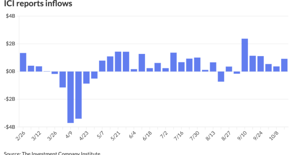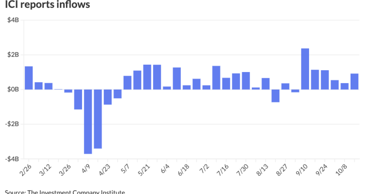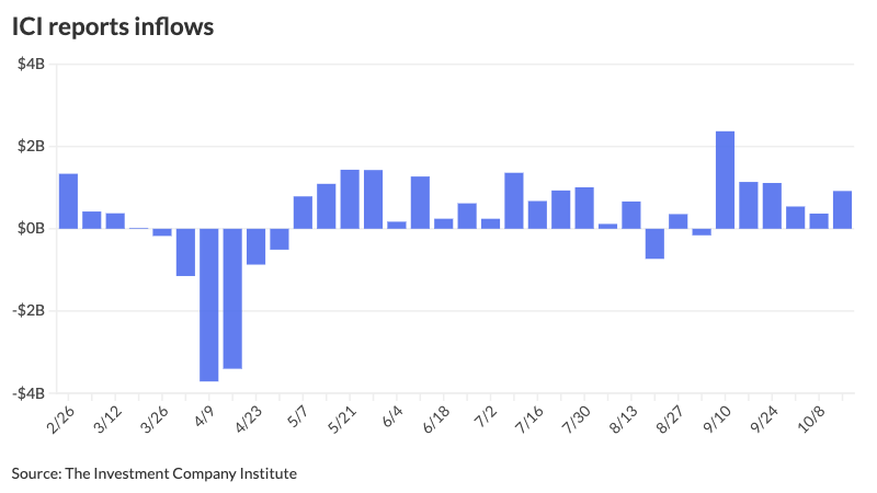The Investment Company Institute Wednesday reported inflows of $918 million for the week ending Oct. 15, following $369 million of inflows the previous week.
