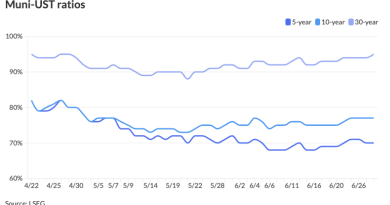 Additionally, relatively low ratios in the muni market — ratios 10 years and in are below 70% — continue to offer decent opportunities for taxables as an alternative investment, Brigati said.